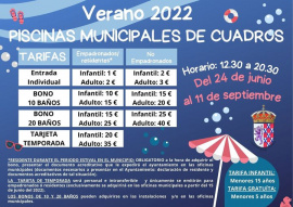 Cuadros inaugura verano y abre sus piscinas a los leoneses. Nuestro unicipio estrena unas instalaciones que ya se han convertido en un referente en la provincia de León, con un amplio programa de actividades para todas las edades y cursos de natación en las instalaciones. El verano es sinónimo de Cuadros y sobre todo se disfruta en familia. Desde este 24 de junio la localidad ha dado el pistoletazo de salida al verano con la apertura de las piscinas que se mantendrá hasta el 11 de septiembre. Un gran espacio En horario de 12:30 de la mañana, hasta las 20:30 horas de la tarde cualquier amante del agua y la tranquilidad podrá darse un chapuzón de felicidad en las piscinas de Cuadros que ya cuentan con más de 10.000 metros cuadrados de instalaciones, lo que les permite un aforo superior a las 2.500 personas. Las instalaciones de Cuadros cuentan con una gran piscina de más de 300 metros cuadrados para adultos, otra de 115 metros cuadrados lúdica y de toboganes, y una piscina de chapoteo de 30 metros cuadrados. Las tres zonas de baño harán, sin lugar a dudas, las delicias de todos los que elijan Cuadros para relajarse en los meses de verano. El consistorio busca cada año mejorar las instalaciones buscando la mayor comodidad y disfrute de sus vecinos y visitantes y por ello, las piscinas de Cuadros son elegidas cada vez por más leoneses para disfrutar de múltiples actividades acuáticas.   Actividades gratuitas Una agenda de actividades, gratuitas con la entrada de la piscina y previa inscripción en taquilla, que cuenta con un Aula de Digestión para los pequeños de la casa todas las tardes de 17 a 19 horas; Aquagim y Zumba,  ambas actividades para mayores de 14 años. Una atractiva oferta de ocio que se complementa con jornadas gastronómicas, así como actividades lúdicas y musicales, organizadas por el Bar de la piscina. El Ayuntamiento completa está oferta lúdica como ya publico InfoCuadros esta semana, con Cursos de Natación los meses de julio y agosto, tanto de iniciación cómo de perfeccionamiento.  Dos niveles: iniciación y perfeccionamiento, en agosto, para niños de 7 a 10 años. El precio de los cursos por niño y turno será de 20 euros para los empadronados en el Ayuntamiento de Cuadros y 40 € para el resto.