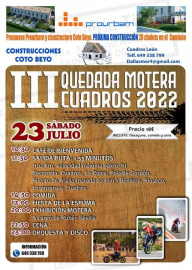 Cuadros se prepara para vivir su sábado más motero del año. Este sábado 23 de julio se celebrará la una concentración motera que tendrá todo para que la fiesta de la moto sea completa, con una paellada popular, mercadillo de artesanía, exhibiciones, exposiciones, entretenimiento para los más pequeños y música para acompañar la presencia de centenares de moteros que se acercarán hasta Cuadros y para todos los vecinos que quieran disfrutar de este día tan singular. El Ayuntamiento de Cuadros apoya este Encuentro Motero de Cuadros 2022 al que todavía pueden sumarse quienes quieran disfrutar de un sábado festivo que tendrá un precio de 18 € . Una inscripción que no solo les permitirá poner a rodar la moto, sino que incluirá actividades y diversión para todos los publicos además de muchas sorpresas más que darán forma a un intenso día con exhibición y exposición motera. Una fecha en el calendario que ya empieza a ser habitual en la provincia para los amamentes de las 2 ruedas.