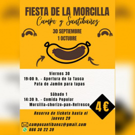 Campo y Santibañez despide septiembre y da comienzo al mes de octubre con la fiesta de la morcilla. Durante los dias 30 y 1 podremos disfrutar de esta culinaria y peculiar fiesta El día 30 de septiembre desde las 19:00 la tasca de la padanía en las Eras del Valle podremos comenzar a disfrutar de las tapas y los pinchos. Y el sábado 1 de octubre desde las 14:30 una gran comida popular con morcilla, chorizo pan y refresco por un precio muy aujustado de 4€ . La reserva de los tickets se podrá hacer hasta el jueves 29 de septiembre.