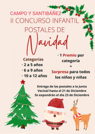 ¿Qué mejor manera que empezar la bienvenida a la Navidad con el 1er concurso infantil de postales navideñas? Eso es lo que habrán pensando los vecinos de la pedanía de Campo y Santibáñez, que acoge esta segunda edición con regalos para todos los participantes y un premio para cada categorías y sorpresa para todos los niños. Categorías • 2 a 5 años • 6 a 9 años • 10 a 12 años Se podrán entregar las postales hasta el día 21 de Diciembre a miembros de la Junta Vecinal de Campo y Santibáñez y las fotografías se expondrán el Viernes 23 de diciembre.