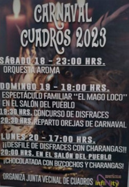 La Junta Vecinal de Cuadros organiza los carnavales de la pedania durante los días 18, 19 y 20 de febrero. La fiesta de carnaval comenzará desde las 23:00h del sábado 18 con la orquesta Aroma. El Domingo habrá un espectáculo de magia a manos de "El Mago Loco" en el salón del pueblo para dar paso al ya veterano concurso de disfraces y terminar degustando unas deliciosas orejas de carnaval. El lunes desde las 17:00h llega el plato fuerte con el desfile de disfraces y charangas por las calles de la pedanía y reponer fuerzas con chocolate y bizcocho. Una fiesta de Carnaval que cada año suma más fuerza  y en la que se espera que el tiempo acompañe a la festividad.
