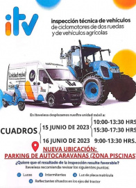 La ITV móvil volverá en junio al municipios de Cuadros, en el Parking de autocaravanas de la zona de las piscinas, los días 15 y 16 en horario de mañana y de tarde para todos los cilomoterores de dos ruedas y vehículos agrícolas. Desde las 10:00 hasta las 13:30 y desde las 15:30h hasta las 17:30 el día 15 de junio y desde las 09:00 hasta las 13:30 el día 16.
