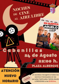El cine de verano hace su sexta entrega el próximo día 24 de agosto en Cabanillas. Desde las 22:00h en la zona de la Plaza Albergue podremos disfrutar de la sexta noche de cine al aire libre que organiza el Ayuntamiento de Cuadros en la pedanía de Cabanillas. Es la sexta parada de un programa lleno de actividades para todas las edades durante todo el verano repartido por todas las pedanías del municipio. Cabanillas será la pedanía escogida para este fin de semana en esta gran iniciativa lúdico-social que ha puesto en marcha el ayuntamiento. Además, todo aquel que quiera asistir a la noche de cine podrá acudir en transporte público, ya que habrá un autobús que recogerá todos los vecinos interesados en las paradas habituales, con salida desde Lorenzana a las 21:15 horas. En guerra con mi abuelo  es una película de 2020 dirigida por Tim Hill con Robert De Niro, Uma Thurman, Christopher Walken, Oakes Fegley, Peter Decker, Laura Marano, Rob Riggle y Cheech Marin entre otros. Os dejamos aquí su sinopsis: El joven Peter se ve obligado a abandonar su habitación cuando su abuelo Ed (Robert De Niro), recientemente enviudado, se muda a su casa. Con la ayuda de sus amigos, Peter declara la guerra a su abuelo para hacerle abandonar la habitación, pero Ed es un testarudo y no va a ponérselo nada fácil. Fuente: FILMAFFINITY