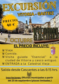 El Ayto de Cuadros organiza una excursión a la ciudad vasca de Vitoria - Gasteiz para el próximo 7 de octubre. Por 40€ podrá disfrutar de transporte, comida, visitar guiada por la ciudad y su casco antiguo así como entrada a la Catedral Vieja y es que Vitoria-Gasteiz es la capital de la comunidad autónoma del País Vasco, situada en el norte de España. En el barrio medieval se erige la catedral gótica de Santa María, con esculturas en la fachada y unas columnas elevadas que llegan a formar torres. La plaza de la Virgen Blanca, del siglo XVII, alberga un monumento a la Batalla de Vitoria (1813). La iglesia de San Miguel cuenta con un gran retablo barroco y una estatua de la Virgen Blanca, patrona de la ciudad La salida será desde Cascantes a las 06:15h y las inscripciones podrán realizarse desde hoy 25 de septiembre con plazas limitadas.