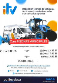 **La ITV móvil regresa a Cuadros para atender vehículos de dos ruedas y agrícolas** El servicio de Inspección Técnica de Vehículos (ITV) móvil estará de vuelta en el municipio de Cuadros durante el mes de junio, ofreciendo su atención en el área de estacionamiento de autocaravanas ubicada en la zona de las piscinas. La cita está programada para los días 13 y 14, con horarios tanto matutinos como vespertinos, dirigidos específicamente a los propietarios de ciclomotores de dos ruedas y vehículos agrícolas. La ITV móvil estará operativa desde las 10:00 hasta las 13:30, y luego desde las 15:30 hasta las 17:30 el día 13 de junio. Para el día siguiente, el 14 de junio, el horario será desde las 09:00 hasta las 13:30. Este servicio móvil ofrece una conveniente alternativa para los propietarios de vehículos, especialmente aquellos que se desplazan en motocicletas de dos ruedas o utilizan maquinaria agrícola en la zona. La ubicación estratégica en el parking de autocaravanas de la zona de las piscinas facilita el acceso y la atención rápida a los usuarios. La realización de la ITV es esencial para garantizar la seguridad y el correcto funcionamiento de los vehículos, así como para cumplir con la normativa legal vigente. Con la presencia de la ITV móvil en Cuadros, se brinda una oportunidad conveniente para que los propietarios cumplan con este requisito sin la necesidad de desplazarse a otras localidades. Se espera que esta iniciativa sea bien recibida por la comunidad local, ofreciendo una solución práctica y accesible para mantener en regla sus vehículos. La presencia de la ITV móvil demuestra el compromiso de las autoridades locales con la seguridad vial y el bienestar de los ciudadanos. En resumen, la ITV móvil estará disponible en Cuadros los días 13 y 14 de junio, ofreciendo servicios de inspección para ciclomotores de dos ruedas y vehículos agrícolas. Los horarios de atención se distribuirán tanto en la mañana como en la tarde, proporcionando flexibilidad para los usuarios.