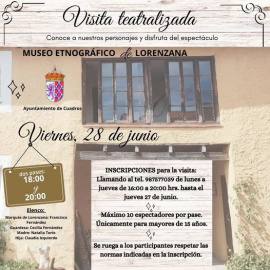 Visita Teatralizada en el Museo Etnográfico de Lorenzana El Museo Etnográfico de Lorenzana tiene el placer de anunciar una emocionante visita teatralizada el próximo 28 de junio. Esta actividad promete ser una experiencia inolvidable para todos los asistentes, combinando la historia y el arte de manera interactiva y entretenida. Detalles del Evento Fecha y Horarios:28 de junio de 2024 - Dos pases disponibles: a las **18:00** y a las **20:00** Elenco: - **Marqués de Lorenzana:** Francisco Fernández - **Guardesa:** Cecilia Fernández - **Madre:** Natalia Torio - **Hija:** Claudia Izquierdo Los visitantes tendrán la oportunidad de conocer a estos personajes históricos en una representación llena de vida y detalles que los transportará a otra época. Inscripciones Las inscripciones para las visitas teatralizadas estarán abiertas hasta el 27 de junio y se podrán realizar vía telefónica. Para garantizar una experiencia íntima y de calidad, cada pase contará con un máximo de 10 espectadores. Las visitas están destinadas a personas mayores de **15 años**. Horario de inscripción: - De lunes a jueves, de **16:00 a 20:00**  Información Adicional La visita teatralizada es una oportunidad única para explorar el museo de una manera dinámica, interactuando con los personajes y disfrutando del espectáculo en un entorno auténtico. Esta actividad no solo educa, sino que también entretiene, ofreciendo una forma novedosa de aprender sobre la historia y la cultura. No te pierdas esta oportunidad de vivir la historia de Lorenzana a través de sus personajes más emblemáticos. ¡Reserva tu lugar y prepárate para un viaje al pasado lleno de emociones y aprendizaje! Para más información y para realizar tu inscripción, comunícate al teléfono del museo dentro del horario indicado.