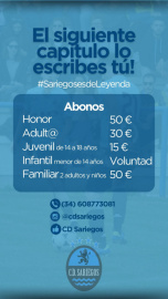 Comienza la campaña de socios 24/25 y desde el club se ha fijado un objetivo claro: ver la Namilla llena hasta la bandera cada fin de semana. El club necesita seguir creciendo en todos los ámbitos para poder afrontar con garantías los retos fijados. Como reza el club en su página de Facebook el CD Sariegos complace anunciar el inicio de la campaña de abonos para la temporada 24/25. Esta nueva etapa presenta desafíos emocionantes, ya que el cambio de categoría ha triplicado el presupuesto. Esto ha obligado a buscar soluciones creativas para cubrir los costos adicionales a los que se enfrentan. Para lograrlo, han decidido implementar un donativo de cinco euros en cada partido en concepto de entrada. Necesitamos la colaboración de todos para que esta aventura sea posible.  El Club se enfrenta al mayor reto de su historia, pero están llenos de confianza y seguridad en su capacidad para estar a la altura. Tras un ascenso meteórico el club afronta una nuvea temporada. Tan solo un año en Primera División Provincial ha sido suficiente para ganar la competición y ascender a Primera División Regional. Un reto para el club que promete dar mucho juego. Modalidades de pago: - Efectivo - Transferencia bancaria al n° de cuenta: Abanca ES5720805857373040033582 - BIZUM (pendiente de habilitar). Teléfono de contacto:  608 77 30 81 o a través de Instagram, Facebook o cualquier persona del club. Os dejamos aquí con el video promocional:   https://www.facebook.com/reel/1214855243299097