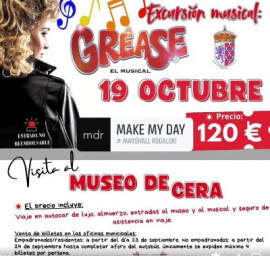 El próximo 19 de octubre, se organiza una emocionante excursión que combina cultura, entretenimiento y nostalgia: una visita a “Grease, el Musical” y al famoso Museo de Cera. Con un precio de 120 €, esta actividad promete ser una experiencia inolvidable para todos los amantes de los musicales y las atracciones icónicas. La excursión ofrece un completo plan que incluye el viaje en autocar de lujo, un almuerzo, entradas tanto al musical como al museo, y un seguro de asistencia durante el trayecto, asegurando una experiencia cómoda y segura para los participantes. Programa de la Excursión: - **Visita al Museo de Cera:** La jornada comenzará con una visita al Museo de Cera, donde los asistentes podrán disfrutar de un recorrido por las figuras de personajes históricos, celebridades del mundo del espectáculo y grandes íconos culturales, todo en un entorno lleno de sorpresas y oportunidades para capturar momentos únicos. - **Grease, el Musical:** El plato fuerte del día será la presentación de “Grease, el Musical”, un espectáculo que ha conquistado los escenarios por su energía, música pegadiza y el carisma de sus personajes. Con la adaptación "Make My Day" dirigida por Marshall Rogalski, los asistentes podrán sumergirse en la vibrante atmósfera de los años 50, reviviendo las icónicas canciones y coreografías que han hecho de esta historia un clásico atemporal. Venta de Billetes: - **Empadronados/Residentes:** La venta de billetes para empadronados y residentes comenzó el pasado 21 de septiembre, asegurando prioridad a los locales para disfrutar de esta gran salida.    - **No Empadronados:** Para los no empadronados, las entradas estarán disponibles a partir del 24 de septiembre y hasta completar aforo. La organización ha limitado la compra a un máximo de 4 billetes por persona para facilitar el acceso al mayor número de interesados. Un Plan Perfecto para Disfrutar en Compañía La excursión a “Grease, el Musical” y la visita al Museo de Cera es una propuesta que combina diversión, cultura y un toque de nostalgia, ideal para compartir en familia, con amigos o incluso en solitario. La mezcla de un viaje cómodo, una comida deliciosa y dos actividades repletas de encanto hace que esta oferta sea inmejorable. ¡No pierdas la oportunidad de vivir un día lleno de música, historia y muchas sorpresas! Asegura tu plaza y prepárate para disfrutar de un plan que quedará grabado en la memoria.