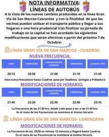La imagen contiene una nota informativa sobre modificaciones en las líneas de autobús de la zona **Gran Vía de San Marcos-Cuadros** y **San Marcos-Lorenzana**, que serán efectivas a partir del **7 de octubre**. Se detallan los siguientes cambios: 1. Línea Gran Vía de San Marcos - Cuadros: Nueva frecuencia: - **León:** 20:15 - **Lorenzana:** 20:50 - **Llegada/Salida Cuadros:** 21:00 - **Lorenzana:** 21:10 - **Llegada a León:** 21:45 Este servicio incluye paradas en **Azadinos**, **Sariegos**, y **Pobladura**. Modificaciones de horario: - **León:** 21:45 - **Lorenzana:** 22:20 - **Llegada/Salida Cuadros:** 22:30 - **Lorenzana:** 22:40 - **Llegada a León:** 23:15 La frecuencia del autobús de las 21:30, que salía desde León, se ajusta a las **21:45**. El resto de los horarios se mantiene sin cambios. 2. Línea Gran Vía de San Marcos - Lorenzana: Modificaciones de horario: - El autobús de las 20:30, que anteriormente salía desde León, se retrasa **15 minutos**, pasando a las **20:45**. El resto de los horarios permanece sin modificaciones. Estas actualizaciones están diseñadas para mejorar la accesibilidad de los vecinos a los servicios de transporte público y asegurar que puedan llegar a sus hogares en un horario más adecuado tras finalizar sus jornadas laborales en la capital.   Podéis consultar el horario íntegro y actualizado de todas las lineas de autobus en el siguiente enlace --> Horario Autobuses Ayto Cuadros