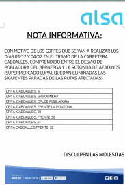 La empresa de transporte ALSA ha anunciado la eliminación temporal de varias paradas de autobús en la carretera Caboalles debido a cortes programados para los días 3 y 4 de diciembre. Las paradas afectadas son: 1. Crta. Caboalles, 17 2. Crta. Caboalles, Gasolinera 3. Crta. Caboalles, Cruce Pobladura 4. Crta. Caboalles, Frente La Pontona 5. Crta. Caboalles, 99 6. Crta. Caboalles, Frente 90 7. Crta. Caboalles, 61 8. Crta. Caboalles, Frente 32 El aviso de ALSA, claramente visible en los puntos de parada y en las redes sociales de la empresa, busca informar a los usuarios sobre estas modificaciones y evitar inconvenientes durante los días señalados. Impacto en los usuarios Los cortes en la carretera y la eliminación de estas paradas se deben a trabajos de mantenimiento esenciales que mejorarán la infraestructura vial. ALSA ha pedido disculpas por las molestias que estos cambios puedan causar y ha recomendado a los usuarios que consulten las rutas alternativas disponibles en su página web o a través de su servicio de atención al cliente. Recomendaciones para los usuarios Se insta a los pasajeros a prever posibles retrasos y cambios en sus itinerarios habituales durante estos días. ALSA ha asegurado que están trabajando en colaboración con las autoridades locales para minimizar el impacto y garantizar que los servicios vuelvan a la normalidad lo antes posible. Compromiso con la calidad del servicio ALSA reafirma su compromiso con la calidad del servicio y la seguridad de sus usuarios, y agradece la comprensión y colaboración de todos durante el periodo de las obras.