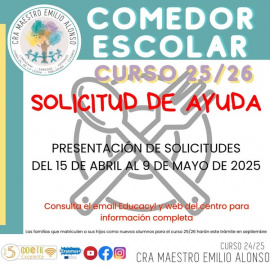 El CRA Maestro Emilio Alonso ha anunciado la apertura del plazo de solicitud de ayuda para el comedor escolar correspondiente al curso 2025/2026. Las familias interesadas podrán presentar sus solicitudes desde el 15 de abril hasta el 9 de mayo de 2025.   Para obtener información completa sobre el proceso, se recomienda consultar el correo de Educacyl y visitar la página web del centro. Además, aquellas familias que matriculen a sus hijos como nuevos alumnos para el próximo curso deberán realizar este trámite en septiembre.   El comedor escolar es un servicio clave para muchas familias, ya que garantiza la alimentación y el bienestar de los estudiantes durante la jornada educativa. Con la apertura de este período de solicitudes, el centro busca facilitar el acceso al servicio de comedor para el alumnado que lo necesite.   Las redes oficiales del CRA Maestro Emilio Alonso, como Facebook, YouTube, Instagram y Twitter, también ofrecen detalles y actualizaciones sobre el proceso. Los interesados pueden mantenerse informados a través de estas plataformas.