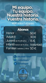 El C.D. Sariegos lanza su nueva campaña de socios para la temporada 2025-2026: “Mi equipo. Tu equipo. Nuestra historia. Vuestra historia.” El Club Deportivo Sariegos ha presentado su campaña de socios para la temporada 2025-2026 con un mensaje cargado de identidad y cercanía: “Mi equipo. Tu equipo. Nuestra historia. Vuestra historia.” Bajo el lema #MiEquipoTuEquipo, el club busca reforzar el vínculo con su afición y atraer a nuevas generaciones de seguidores. La imagen promocional muestra a los jugadores del equipo abrazados, reflejando unidad, compromiso y espíritu colectivo, valores que el club quiere transmitir dentro y fuera del campo. El enlace del video campaña, aquí: La campaña incluye una variada y accesible oferta de abonos para facilitar el acceso a toda la comunidad: Honor: 50 € Adult@: 30 € Juvenil (de 14 a 18 años): 15 € Infantil (menores de 14 años): A voluntad Familiar (2 adultos y niños): 50 € Esta temporada destaca la inclusión del abono infantil “a voluntad”, una apuesta del club por fomentar la asistencia de los más pequeños sin que el aspecto económico sea una barrera. Además, el abono familiar se consolida como una opción ideal para que padres e hijos disfruten juntos del fútbol local, por un precio único y competitivo. El C.D. Sariegos, que continúa consolidando su proyecto deportivo y social en la comarca, ha habilitado varios canales para la información y contacto, incluyendo el número de teléfono (+34) 608 773 081 y sus redes sociales: Instagram (@cdsariegos) y Facebook (CD Sariegos). Con esta campaña, el club quiere recordar a sus vecinos que el fútbol va más allá de los 90 minutos: es una historia compartida, una tradición que se transmite de generación en generación, y una comunidad que se fortalece en cada partido.