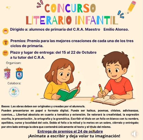 El Colegio Rural Agrupado Maestro Emilio Alonso ha puesto en marcha una nueva edición de su Concurso Literario Infantil, una iniciativa que busca fomentar la creatividad, la imaginación y el gusto por la escritura entre el alumnado de Educación Primaria. El certamen está dirigido a todos los estudiantes de primaria del C.R.A. Maestro Emilio Alonso, quienes podrán presentar sus propias creaciones literarias en diferentes formatos: haikus, poemas, chistes, adivinanzas, cuentos, entre otros. La única condición es que las obras sean originales y creadas por los propios alumnos y alumnas. Los trabajos podrán entregarse del 15 al 22 de octubre, directamente al tutor o tutora del centro educativo, y habrá premios para las mejores obras de cada uno de los tres ciclos de primaria. El acto de entrega de premios se celebrará el 24 de octubre, en una jornada en la que la literatura, la imaginación y la alegría serán protagonistas. Entre las bases del concurso, se destaca la importancia de la libertad absoluta en el tema y el estilo, así como la valoración de la creatividad y la expresión personal de cada participante. Las obras deberán presentarse en papel, con nombre, apellidos, curso y localidad del autor o autora, además de la fecha y el título del texto. El certamen cuenta con la colaboración del Ayuntamiento y busca, un año más, estimular el talento literario de los más pequeños y despertar en ellos el amor por la lectura y la escritura. “Anímate a escribir y deja volar tu imaginación” es el lema con el que el C.R.A. Maestro Emilio Alonso invita a su alumnado a participar en esta entrañable actividad cultural.