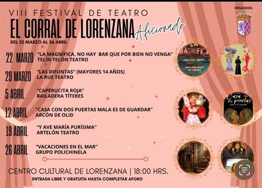 El municipio de Lorenzana volverá a convertirse esta primavera en punto de encuentro para los amantes del teatro con la celebración de la VIII edición del Festival de Teatro Aficionado “El Corral de Lorenzana”. El ciclo cultural se desarrollará entre el 22 de marzo y el 26 de abril en el Centro Cultural de Lorenzana, con una programación compuesta por seis representaciones para todos los públicos. El festival arrancará el 22 de marzo con la obra “La magnífica, no hay bar que por bien no venga”, a cargo de Telín Telón Teatro. Una semana más tarde, el 29 de marzo, será el turno de “Las difuntas”, una propuesta dirigida a mayores de 14 años interpretada por La Rue Teatro. La programación continuará el 5 de abril con la representación infantil “Caperucita Roja”, de Bailadera Títeres, pensada especialmente para el público familiar. El 12 de abril, la compañía Arcón de Olid pondrá en escena “Casa con dos puertas mala es de guardar”, una clásica comedia del teatro español. El festival seguirá el 19 de abril con “Y Ave María Purísima”, interpretada por Artelón Teatro, y concluirá el 26 de abril con la obra “Vacaciones en el mar”, del Grupo Polichinela. Todas las funciones tendrán lugar a las 18:00 horas en el Centro Cultural de Lorenzana y la entrada será libre y gratuita hasta completar aforo, una iniciativa que busca acercar el teatro aficionado a vecinos y visitantes, fomentando la cultura y el ocio en el municipio.